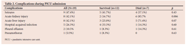 The most common complications during the PICU admission were seizures (n=9, 47.4%), acute kidney and liver injury (n=8, 42.1% each), and hospital-acquired infections (HAI) (n=5, 26.3%) (Table 2).