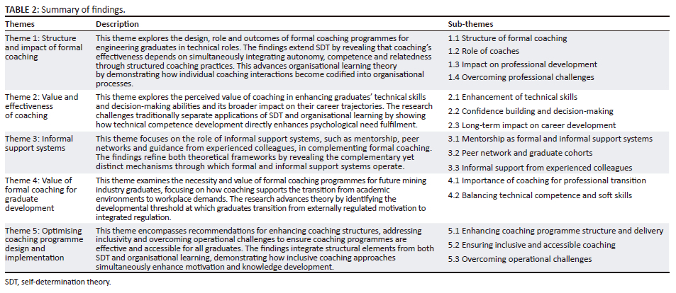 Table 2 provides a structured summary of the key themes and subthemes derived from the study's findings. It outlines the core areas of focus that emerged from the analysis of participants' experiences with formal coaching. Each theme and subtheme reflects aspects of the impact of coaching on the professional development of engineering graduates.
