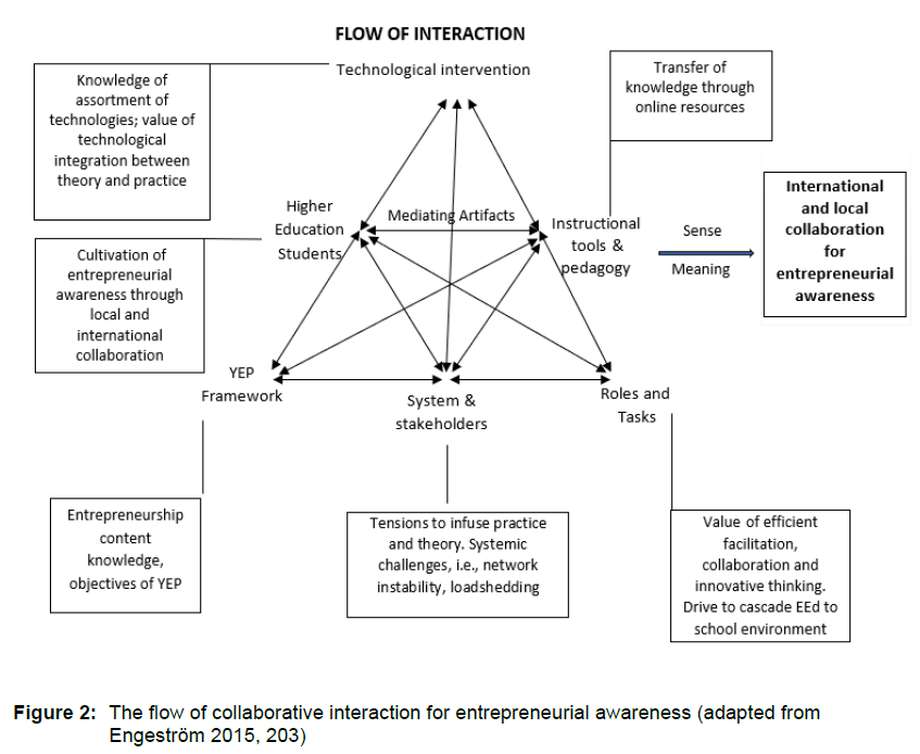 Given the limited literature on structured collaboration across faculty and international borders related to student teacher and school contexts for EEd, this study can add value in cultivating entrepreneurship awareness. The cross-faculty collaboration specifically, presents opportunities for expanding traditional pedagogies for EEd in higher education within the South African context, whereby learning could take place through a flow of interaction. By examining collaborative interaction, we extended the discussion to the influence of creating online resources as part the instructional tools and pedagogy adopted by local and international participants. The activity theory perspective gave credence to responding to the two crucial aspects of this research: firstly, how interactive collaboration for EEd can occur in the context of student teachers, and secondly, how the various participants in this study are influenced by the flow of interaction of the activities in cultivating entrepreneurial awareness. Regarding the first aspect, the overall finding is that student teachers viewed their contributions as valuable, albeit with initial apprehension at team level. The more they were exposed to the project, the more they moved away from the "I" to "We" (Warhuus et al. 2017) and started to perceive themselves as educators who can potentially make a difference in cultivating EEd at school level. They experienced the practical implementation of linking theory to practice by using instructional tools. This experience was insightful, gratifying, and valuable.