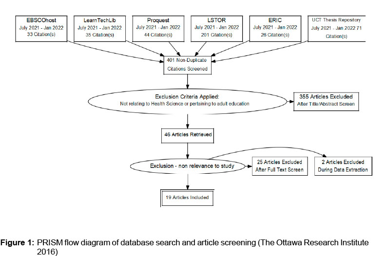 A systematic search was conducted using the "advanced search function" on the abovementioned databases. The following search terms were used in various combinations: "recognition of prior learning or RPL", "vocational or skill training or vocational education or skill-based training", "emergency care provider or emergency medical care or emergency care", "support needs" and "postgraduate studies". Further specifications of the date range from 2000 to current, and English language, were included. The review was done from July 2021 to January 2022. The lack of literature focusing on the prehospital RPL system in South Africa prompted search expansions into the health science field. As only a few articles were found in the South African context, the search was broadened to include international studies, and a total of 401 non-duplicate articles were found.