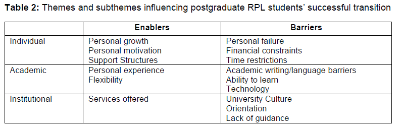 After evaluating the enablers and barriers in the literature reviewed for this study, multiple themes were identified. These were categorised into subthemes based on individual, academic and institutional enablers and barriers. To accurately determine RPL students' support requirements, an understanding of their challenges and support areas is vital. Although many enablers were identified, there are multiple areas where support requirements can be actioned for improved transition. It is of interest to note that despite barriers' potential negative impact, many students embrace these as opportunities and, on reflection, realise that the barriers became enablers through their personal transition during studies. It is in this growth process where true transition occurs.
