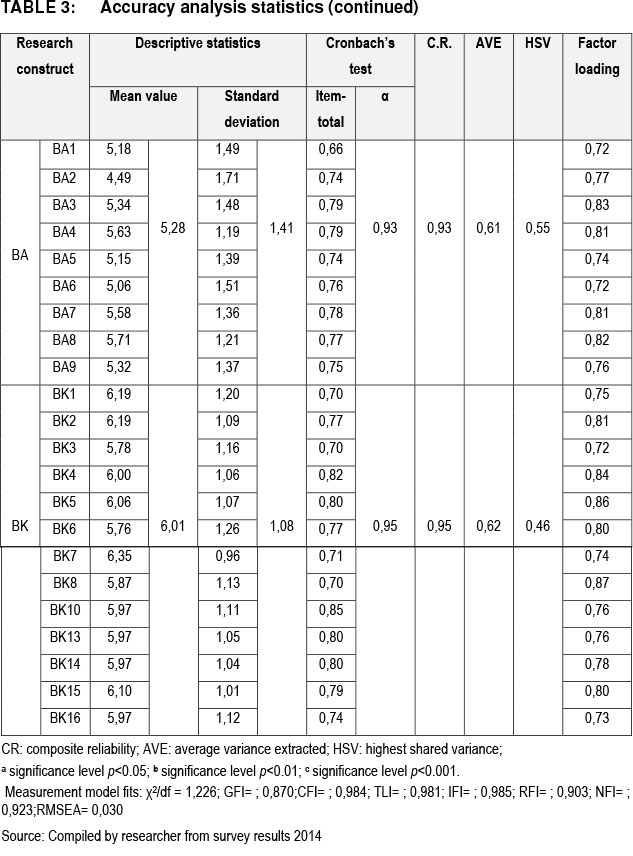 All average variance extracted (AVE) values were above 0.4 and most approached 0.5, thus being acceptable according to the literature (Fraering & Minor 2006:284-306). These results reveal evidence of marginal to acceptable levels of research scale reliability.