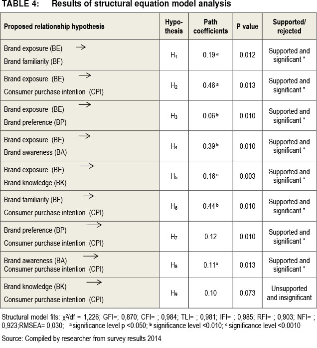 Although the remainder of the hypotheses indicated significant results, the strength of the relationships was moderate. For example, brand exposure positively influences brand familiarity (BF), brand awareness (BA) and brand knowledge (BK). This means that the degree of brand exposure to CGC positively influences brand familiarity, brand awareness and brand knowledge.