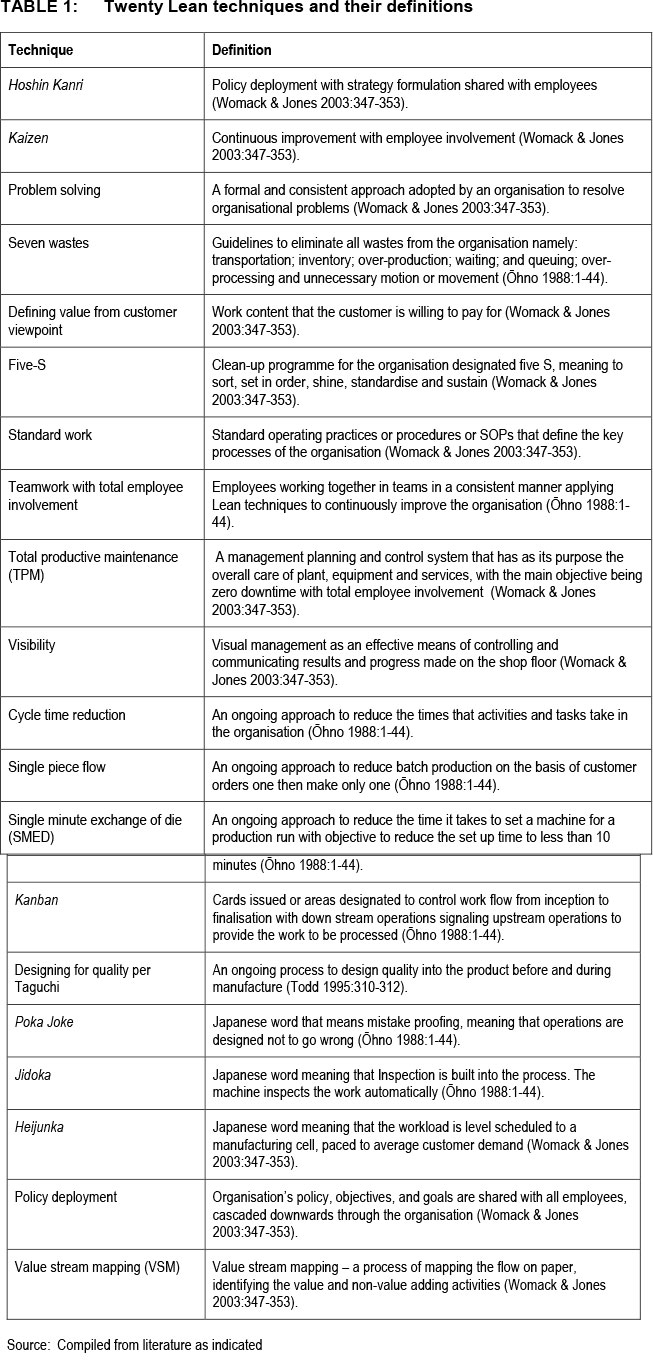 The literature review considers the extent of literature of how a Lean transformation, covering the Lean principles identified by Womack and Jones (2003:15-28) of specifying value, identifying the value stream, creating continuous flow, establishing pull and working to achieve perfection, will affect discrete manufacturing organisational structure and behaviour. For effective Lean transformations twenty Lean techniques have been identified for implementation, based on definitions (Ōhno 1988:1-44; 121-130; Quarterman 2007:14-19; Womack & Jones 2003:347-353). These techniques are defined in Table 1.