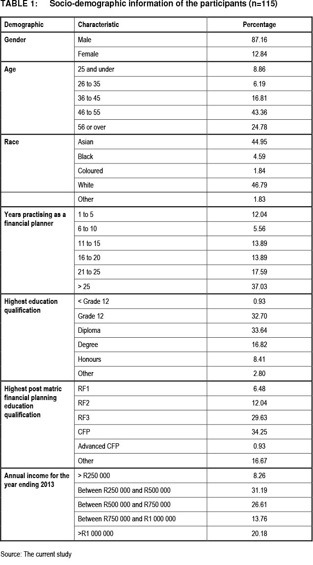Table 1 shows the summary of socio-demographic informations of the respondents. Results indicated that the independent financial planning industry in KZN is a male dominated industry, with over 88% of the respondents being male. Majority (77%) of the respondents are over 45 years with the average age of respondents being approximately 51 years. This supports the finding of survey conducted by the Institute of Practice Management (2012:1 -29) that found that the average age of planners was 54 years. This supports the view of Bird (2014:Internet) that independent financial planning as a career was on the decline. This is a cause for concern as it indicates that the industry is an aging one with fewer people entering the industry or becoming independent financial planners.