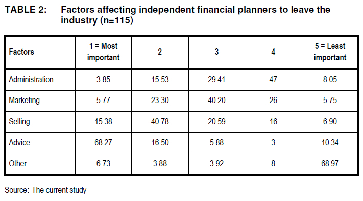 Thus in the next five to ten years many of the financial planners in SA would have retired (Institute of Practice Management 2012:1-29). There is a decrease in the number of new entrants into the industry (Coetzer 2013:Internet). This will put pressure on independent financial planners' succession and continuity plans. According to Field, Froser and Kolarl (2007:3646-62), the broker market is declining due to the changing regulatory environment. Therefore, the objective of this study was to determine the factors affecting independent financial planners to leave the industry in KwaZulu-Natal, SA.