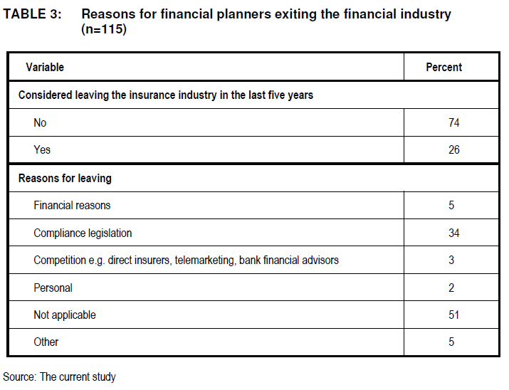 Over one quarter of all respondents have indicated that they had considered exiting the industry within the last five years (Table 3). Of those planners that considered exiting the industry, compliance legislation is cited as the most popular reason (73%) for exiting the industry (table 3).