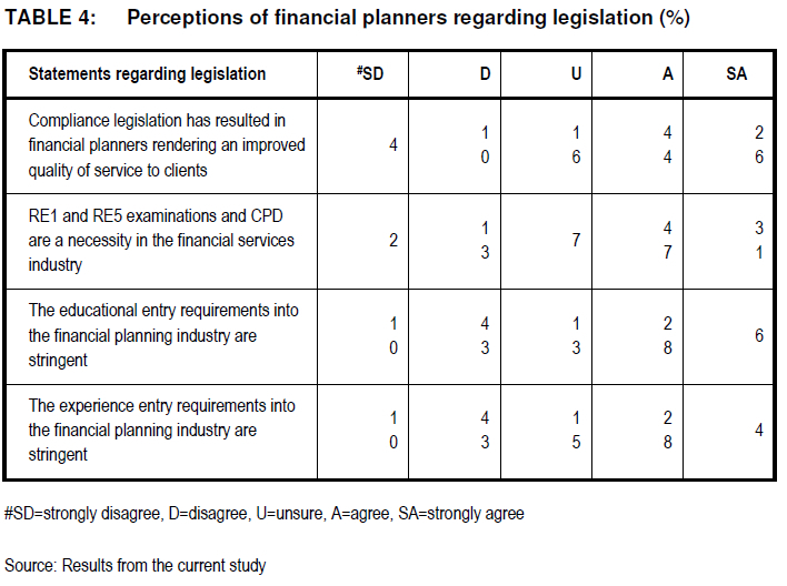 Table 4 shows that 70% of respondents either agree or strongly agree that compliance legislation has resulted independent financial planners rendering an improved quality of service to clients.