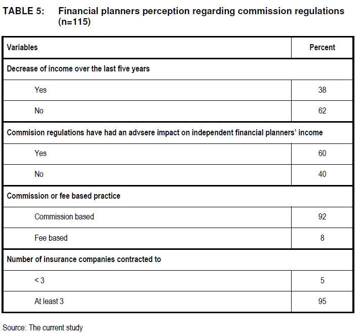 Results had shown that legislation was a key factor affecting independent financial planners. A quarter of respondents indicated that they had considered exiting the industry within the last five years and among them 73% reported compliance legislation as the major reason. One third of respondents experienced a decrease in income over the last five years with 60% confirming that commission regulations negatively impacted on their income. Over half of the respondents agreed that clients are using alternative channels for the purchase of insurance products.