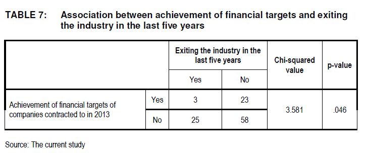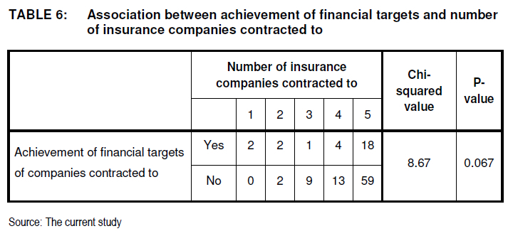 Table 7 indicates that almost 90% of respondents who did consider leaving the insurance industry in the last five years did not meet the financial targets of the all the insurance companies with whom they had contracts in 2013. Further, 71% of repsondents who did not intend leaving the industry in the last five years did not meet the financial targets of all insurance companies with whom they had contracts in 2013. Insurance companies include a financial target in the contract granted to an independent financial planner. If planners fail to meet this target certain services and benefits associated with having a contract with that insurance company are not provided. Industry practice dictate that independent financial planners provide clients with three quotes from three different companies. However, if they are unable to meet the financial targets of the companies, they face the risk of having their contract suspended, wirhdrawn or cancelled. This could lead to them exiting the industry due to them not having a minimum of three insurance contracts.