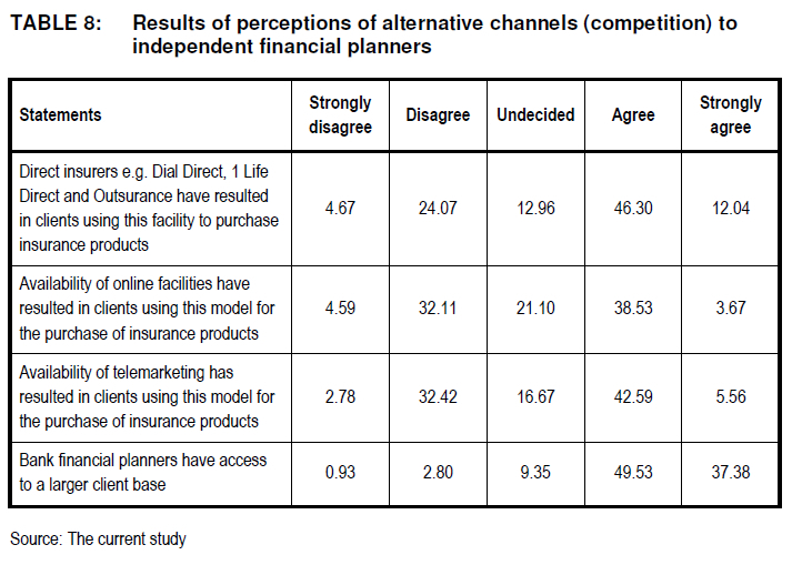 Views in respect of alternative channels (competition) on independent financial planners are summarized in table 8. It was found that 56% of all respondents agree or strongly agree that clients are using direct insurers to purchase insurance products, and 42% of respondents either agreed or strongly agreed that consumers were using online facilties to purchase insurance products. This supports the results of the Capgemini survey that found that customers now use the internet for research and purchase of insurance products (Capgemini 2013:1-48).