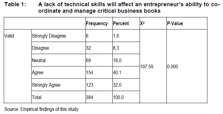 This section focuses on and discusses the findings of this study pertaining to innovative leadership in the KZN manufacturing sector of SMEs. Table 1 reflects responses to the statement that a lack of technical skills will affect an entrepreneur's ability to co-ordinate and manage critical business books.