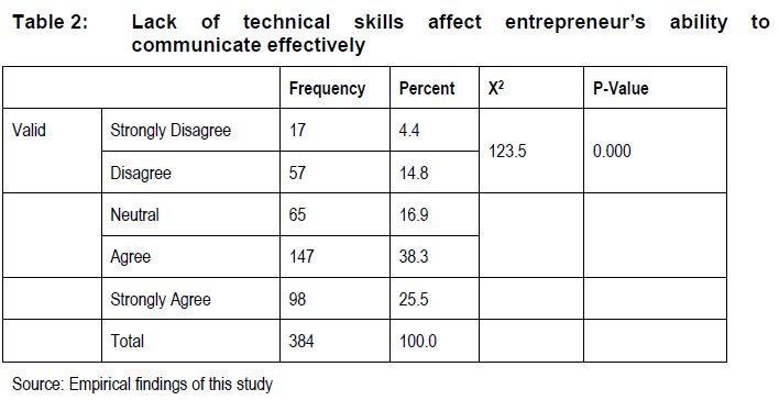 According to Sutevski (2019), technical skills are not only related to the ability to use machines, production tools and various business equipment, they are also skills critically needed to design strategic business approaches, manage business books, and design different types of products and services. Katz (2009) highlighted that technical skills involve specialised knowledge, analytical ability within that speciality, as well as using tools and methods or systems of the specific discipline. As shown (Table 1), a significant number of respondents (154 or 40.1%) agreed and 123 (32%) strongly agreed that a lack of technical skills will affect an entrepreneur's ability to co-ordinate and manage critical business books. With 69 (18%) of the respondents that remained neutral, and 32 (8.3%) that disagreed, there were only six (1.6%) respondents that strongly disagreed with the statement. A Chi-square test was conducted to determine whether a lack of technical skills will affect an entrepreneur's ability to co-ordinate and manage critical business books. The results show (X2 = 197.59; df = 4; P = 0,000) for this variable, indicating a lack of technical skills will affect an entrepreneur's ability to co-ordinate and manage critical business books. Responses to the statement that a lack of technical skills of entrepreneurs affects their ability to communicate effectively are summarised (Table 2).