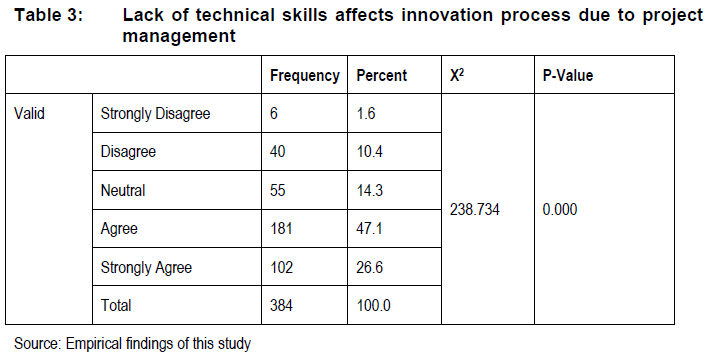 As shown (Table 2), a moderate number of the respondents (147 or 38.3%) agreed and 98 (25.5%) further strongly agreed that a lack of technical skills affects the ability of an entrepreneur to communicate effectively. A lesser number of respondents (65 or 16.9%) were neutral, while 57 (14.8%) disagreed and 17 (4.4%) respondents strongly disagreed with the statement. The findings reveal that the respondents viewed and considered having technical skills as essential, due to it enabling innovative leadership to communicate eloquently because of the comprehensive knowledge and expertise they have in that field. A Chi-square test was conducted to determine whether a lack of technical skill will affect the ability of an entrepreneur to communicate effectively. The results show (X2 = 123.5; df = 4; P = 0,000) for this variable, indicating a lack of technical skills will affect the ability of an entrepreneur to communicate effectively. Table 3 portrays the response frequencies and percentages to a lack of technical skills affecting the innovation process, as a result of project management.