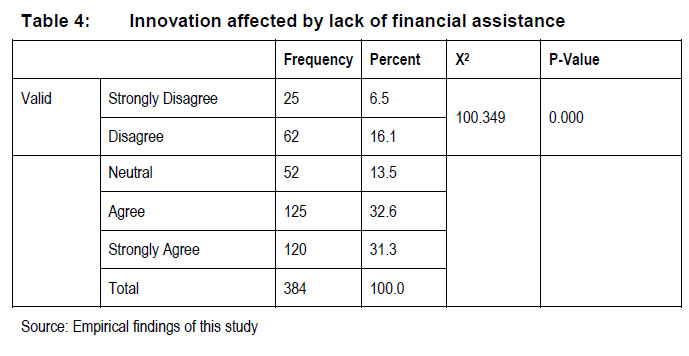 As illustrated (Table 3), a significant number of the respondents (181 or 47.1%) agreed, with a further 102 (26.6%) respondents that strongly agreed with a lack of technical skills affecting the innovation process due to project management skills. A lesser number of respondents (55 or 14.3%) indicated neutral to the statement, while 40 (10.4%) disagreed and only six (1.6%) respondents strongly disagreed with the statement. A Chi-square test was conducted to determine whether a lack of technical skills affects the innovation process due to project management skills. The results show (X2 = 238.734; df = 4; P = 0,000) for this variable, indicating a lack of technical skills affects the innovation process due to project management skills. Table 4 illustrates responses to the statement that Innovation is affected by the lack of financial assistance from the national government.