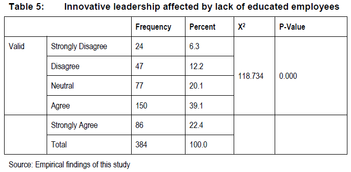 It was determined (Table 4) that a moderate number of respondents (125 or 32.6%) agreed and 120 (31.3%) further strongly agreed that innovation is affected by a lack of financial assistance from the government. According to Smith, Pretorius, Kotecha, Menzies and Erwin (2019), the difficulties experienced by SMEs in the manufacturing sector, in acquiring funding from the government or other financial institutions, are thus based on the entrepreneur's inability to prepare relevant business documentation required by finance providers. The majority of applications are rejected due to poor financial reporting skills and lack of experience by the firm owners. A lesser number of respondents (62 or 16.1%) disagreed with the statement, while 52 (13.5%) were neutral and only 25 (6.5%) respondents strongly disagreed. This result is supported by a Chi-square test conducted to determine whether innovation is affected by the lack of government financial assistance. The results show (X2 = 100.349; df = 4; P = 0,000) for this variable, indicating a lack of government financial assistance affects manufacturing sector SMEs' ability to be innovative and acquire new technological advancements. Table 5 illustrates whether a lack of educated employees affects leadership innovation.