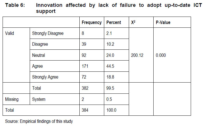 As shown (Table 5), a moderate number of respondents (150 or 39.1%) agreed and 86 (22.4%) further strongly agreed that innovation is affected by lack of educated employees. A lesser number of respondents (77 or 20.1%) indicated neutral to the statement, while 47 (12.2%) respondents disagreed and only 24 (6.3%) strongly disagreed with the statement. This means roughly 60% of respondents viewed and considered an educated workforce as instrumental in innovation development. These findings are supported by Leiponen (2005); Toner (2011) and McGuirk, Lenihan and Hart (2014), who asserted that educated and knowledgeable employees are an enabling factor in innovation, since the level of innovation is incremental and usually gives direction in terms of the firm's future, role, adaption, and diffusion of technical and firm change. Accordingly, as stated by the OECD (2018), successful entrepreneurship, innovation and business growth are dependent on educated employees' expanded skillset. Small Medium Enterprise South Africa (2017) reflected that the manufacturing sector SMEs will battle to reach innovative growth without educated and skilled employees; with an OECD report (2013) having cautioned that acquiring and retaining educated and qualified employees with vast skills might prove to be a challenge to manufacturing sector SMEs, due to financial constraints. A Chi-square test was further conducted to determine whether a lack of educated employees had a significant impact on business innovation. The results show (X2= 118.734; df = 4; P = 0,000) for this variable, indicating that uneducated employees affect the level of innovation the firm is able to implement and achieve. In view of this, it can be agreed that having educated and knowledgeable employees serves as an integral tool for a firm's sustainability. Table 6 illustrates whether respondents perceive innovation is affected when failing to adopt up-to-date ICT.