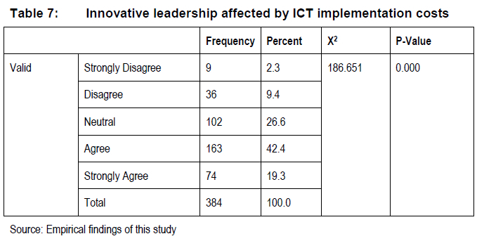 The findings illustrate (Table 6) that a significant number of the respondents (171 or 44.5%) agreed and 72 (18.8%) strongly agreed innovation is affected by failure to adopt up-to-date ICT support. A lesser number of the respondents (92 or 24%) were neutral, while 39 (10.2%) disagreed and only eight (2.1%) respondents strongly disagreed with the statement. These findings evidently signal that ICT adoption is considered by many innovative leaders as an essential component of innovation. According to studies conducted by Moghavvemi, Hakimian and Feissal (2012), Rahab and Hartono (2012), Al Bakri (2017); Gono, Harindranath and Özcan (2016); Razzali et al. (2018) and Agwu (2018), up-to-date ICT adoption is a critical factor to innovation and a necessity for gaining competitive advantage and most importantly, for improving and promoting business efficiency. To determine the impact of ICT adoption on innovation, a Chi-square test was conducted. The results show (X2= 200.12; df = 4; P = 0,000) for this variable, indicating innovation is affected by the inability of SMEs in manufacturing to acquire and maintain technological advancements. Dias, Franco and Pereira (2012) and OECD (2018) argued one of the primary barriers to the adoption of technological advancements is a lack of ICT skills, experience and resources to use ICT in the firm. Table 7 shows how leadership is affected by the cost of implementing ICT.