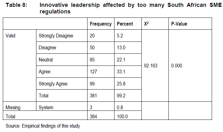 As shown (Table 7), a significant number of respondents (163 or 42.4%) agreed and 74 (19.3%) further strongly agreed that innovative leadership is affected by ICT implementation costs. A considerable number of the respondents (102 or 26.6%) were neutral, while 36 (9.4%) disagreed and nine (2.3%) respondents strongly disagreed with the statement. A Chi-square test was further conducted to determine whether innovative leadership is affected by the cost of ICT implementation. The results show (X2= 186.651; df = 4; P = 0,000) for this variable, indicating that ICT implementation costs negatively influence the adoption of ICT and can be considered as a critical hindrance in achieving technological innovation in manufacturing sector SMEs. This is further highlighted in a study conducted in both Ghana and Botswana by Asare, Gopoang and Mogotlhwane (2012) where, even though ICT usage provides varied benefits, the high cost of both ICT facilities and usage of ICT facilities are a serious concern to innovative leadership. Ghobakhloo, Sabouri, Hong, and Zulkifli (2011) argued and further suggested government should assist by considering what exactly is needed to support ICT adoption in SMEs in the manufacturing sector and provide the necessary assistance. Table 8 reflects responses to excessive regulations affecting innovative leadership.