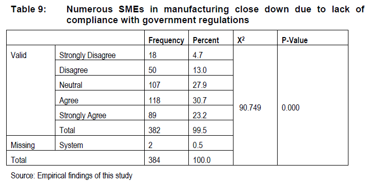 Mupemhi, Duve and Mupemhi (2013) assert that the government of any country is responsible for instituting policies, legal frameworks and procedures that govern how business is conducted and operates within its borders. Boshoff (2018), however, argued that the SA regulatory environment is hostile to SMEs, when the ever-increasing demand of costs needed for compliance with various reporting standards, permits, and accreditation by different institutions, as well as business administration that has to comply with different business operating standards. Small businesses are also subjected to the same minimum wage requirements as big businesses and the same exorbitant charges from inefficient state-owned enterprises (Susman 2017). This, according to the author, is enough to discourage any prospective entrepreneur from opening their own business. According to Barron (2017), SA is well behind its peers in forming an enabling environment that will support and encourage the continued existence of manufacturing sector SMEs, taking into account its significance as a key driver of rapid economic growth and association of employment, both directly and indirectly (Zalk 2014). One of the critical aspects highlighted by Lekhanya (2016), is governments' burdensome regulations that create a very turbulent environment for SMEs and affect business growth. The findings (Table 8) further show a moderate number of the respondents (127 or 33.1%) agreed and 99 (25.8%) strongly agreed that innovative leadership is affected by too many South African SME regulations. A lesser number of respondents (85 or 22.1%) indicated, neutral with only 80 (13%) and 20 (5.2%) respectively disagreeing and strongly disagreeing with the statement. To test whether excessive SME regulations impede leadership innovation, a Chi-square test was conducted. The results show (X2= 92.163; df = 4; P = 0,000) for this variable, indicating that the findings are in accordance with literature, in that too many SME regulations have a direct impact on innovative leadership. The findings show (Table 9) a lack of compliance with government regulations resulting in the closure of many SMEs in the manufacturing sector.