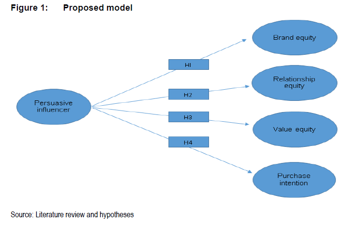 Quality, cost, and accessibility of products and services influence value equity (Lemon, Rust & Zeithaml 2001). It is derived from the benefits consumers receive from purchases when compared to the price of the product (Razzaq et al. 2017). Value equity, therefore, forms the base of any company's relationship with the customer for long-term survival (Kim et al. 2010; Lemon et al. 2001). It was indicated above that influencers are perceived to be credible (Liljander et al. 2015; Metzger & Flanagin 2013), knowledgeable, and respected individuals (Bognar et al. 2019), and that their messages appear to be UGC. A User-generated message helps with Influencer messages' persuasive power (Huang, Burtch, Gu, Hong, Liang, Wang, Fu & Yange 2019). Influencers' postings on social media are likely to influence the cost-benefit evaluation of any potential customer. The theory of social influence also deals with people's desire to comply, identify and internalise behaviours recommended by influencers (Crano 2000; Kelman 1958). Lastly, it is generally accepted that customers referred by influencers bring more revenue, and are more profitable (Palmatier, Kumar & Harmeling 2017; Van den Bulte, Bayer, Skiera & Schmitt 2018). It can, therefore, be hypothesised that: