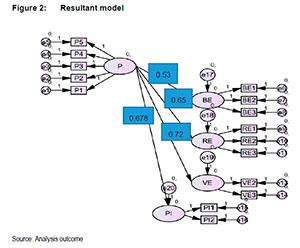 According to Schimmack (2019), construct validation requires the demonstration of both convergent and discriminatory validity. Convergent validity assesses the level of correlations of multiple indicators of the same construct (Sarstedt, Ringle, Smith, Reams & Hair 2014), and thus ensure that concepts that should be related are indeed related (Zikmund, Babin, Carr & Griffin 2010). To establish it, the researchers followed the scholarly recommended approach of using both the composite reliability (CR), and the average variance extracted (AVE) values. Their cut-off values are >0.6, and >.5 respectively (Wang, Cheng, Purwanto & Erimurti 2011), For AVE, the formula AVE=Σκ2 / n, where K represents the factor loadings of the indicators, and n, the number of items measuring the construct (Ahmad, Zulkurnain & Khairushalimi 2016; Ab Hamid, Sami & Sidek 2017). All the AVE values were acceptable as they ranged between 0.5 and .63. The formula for calculating the CR is CR= Σκ2 / κ2 + [1- κ2] (Ahmad et al. 2016). All scale items exceeded the threshold values, except VE1, which loaded weakly (below 0.3), prompting its' removal for further analysis. The final model is displayed in Figure 2 below.