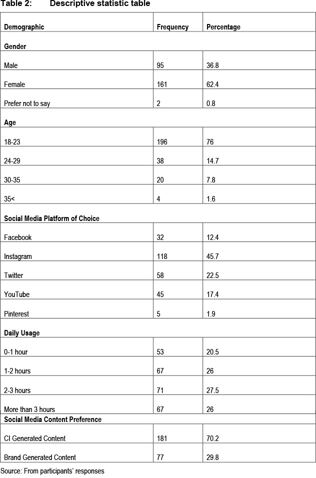 From the Table 2, it is apparent that 62% of the willing participants were female while 37% of participants were male and 1% preferred to not specify their gender. Females made up most of the sample. About 76% of participants were in the range of 18-23 years old, which was expected, as all the participants were university students. Instagram was the most preferred/used social media platform with 46% of participants indicating it was their platform of choice, followed by Twitter at 23%. The daily social media usage was evenly split as the figures in the table. About 21% of participants used social media for between 0 and 1 hour per day. Participants who use social media for 1-2 hours and more than 3 hours a day both account for 26% of the sample respectively. Participants with daily usage of 2-3 hours represented 27% of the sample. On the choice of the content recommending brands, about 70% of participants preferred influencer generated content with only 30% preferring brandgenerated content.