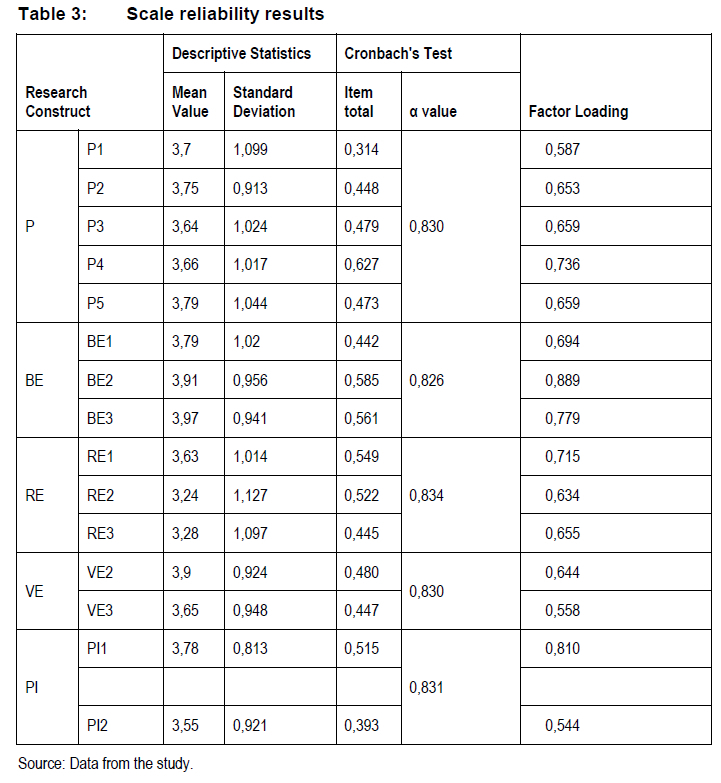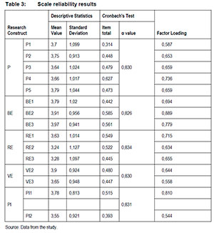 Cronbach Alpha coefficients were used for reliability checking (Larwin & Harvey 2012). A figure of 0.7 or higher is acceptable. Reading from Table 3 below, all Cronbach Alpha values were above 0.8, and scale reliability was therefore confirmed.