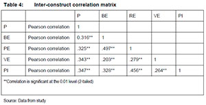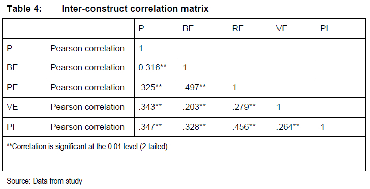 Taking the above into consideration, DV for the present study was confirmed using the inter-construct correlation matrix as recommended by many other scholars (Morar, Venter de Villiers & Chuchu 2015; Van Mierlo, Vermunt & Rutte 2009; Shaffer, De Geest & Li 2016). ln this approach, the higher the correlation between the constructs, the lower the discriminant validity of the variables (Nunnally & Bernstein 1994). Different scholars recommend different cut-off values. According to Chinomona, Lin, Wang and Cheng (2010), the inter-correlations for all paired latent variables should be less than one. Nunnally and Bernstein (1994) recommend a threshold value of 0.7, and Kenny (2019) a value of 0.85. Table 4 below, shows the inter-correlation values for all paired latent variables and they all range between 0.497 and 0.203. Discriminant validity was therefore confirmed.