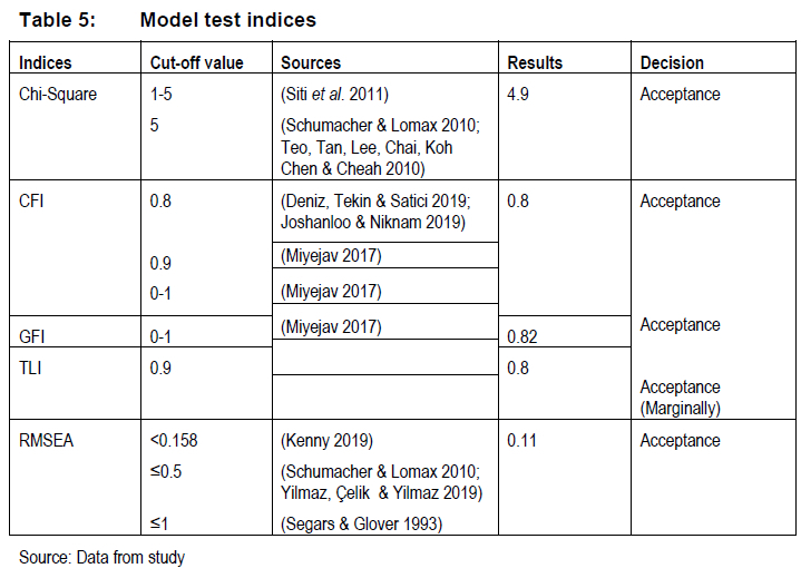 To address these concerns, many scholars recommend that no decision concerning the goodness of fit should be based on a single index, no matter how favourable to the model that index might appear (Gullen 2001; Hooper, Coughlan & Mullen 2008; Raykov & Marcoulides 2012; Tomarken & Waller 2005). For that reason, GOF should be assessed using a variety of indices (McNeish 2018; Yuan et al. 2016). As shown above, the use of indices brings into sharp focus the problem of deciding on the cut off values. Scholars do not agree on these values as well (Greiff & Heene 2017; Saris, Satorra & Van der Veld 2009). Given the above into account, the researchers used the pragmatic approach of using five commonly used fit indices (Byrne 2012; Kline 2015), which are Chi-Square test, CFI, GFI, TLI, and RMSEA (Miyejav 2017; Shi et al. 2019). Table 5 displays all the fitness indices obtained, together with some sources of their threshold values. According to Chang and Chen (2009), the CFA results indicate a promising and acceptable overall model fit. Given the above, the present researchers accepted the values shown in Table 5 as the basis for accepting the model fitness test.