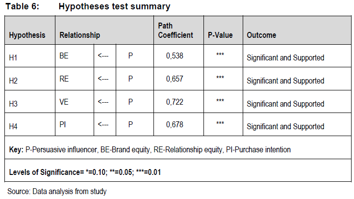 As seen from the results from Table 6, influencers positively influence a firm's: brand equity, relationship equity, value equity, and the intention of customers to purchase a brand's offer through their social media activities. The effect, of the persuasive influencer on these different forms of customer equities is not in equal measure. For instance, the influencer's impact on value equity is much more than its' impact on brand equity as evidenced by the path coefficients 0.722 and 0.538 respectively. Given a choice of which customer equity managers should concentrate on influencing, it makes sense to target these different forms in order of value equity, purchase intention, relationship equity, and lastly, on brand equity.