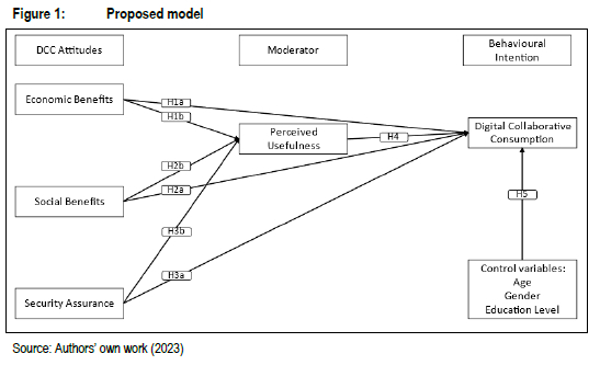 This study formulates hypotheses to test the relationship between the latent variables in the model. The constructs hypothesised are economic benefits, social benefits, and security assurance as the predictors, with DCC as the predicted variable. The model is moderated by perceived usefulness. Figure 1 depicts the theoretical model, which synthesises the relations between the latent variables and their hypotheses. Control variables are gender, age and education, respectively, which test the effect on DCC.