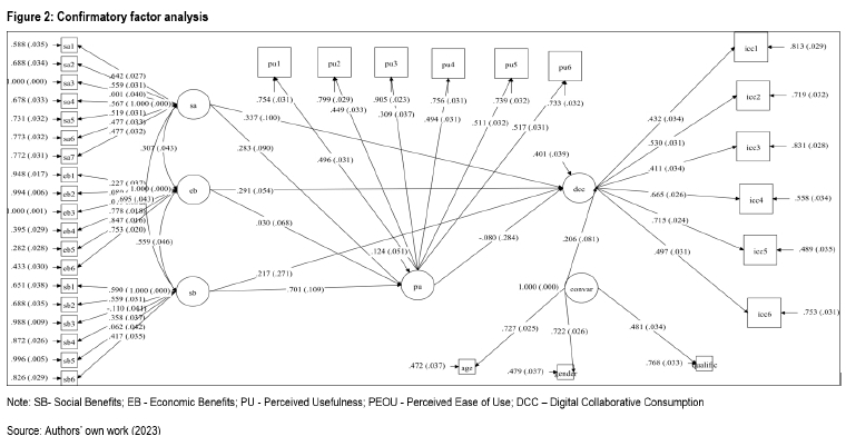 The DCC model relations were tested using Structural Equation Modelling (SEM). Hair et al. (2020) view SEM as a multivariate technique significant for analysing causal models. In this study, by simultaneously examining a series of relationships between variables, the researchers used SEM technique to test the conceptual model indicated in Figure 2. To apply the SEM model, confirmatory factor analysis (CFA) was used to certify that latent variables were indeed represented by the items showing factor loading, which are within the range of acceptable range. Hair Jr et al. (2010) recommend that loadings of ±0.50 or higher are considered significant.