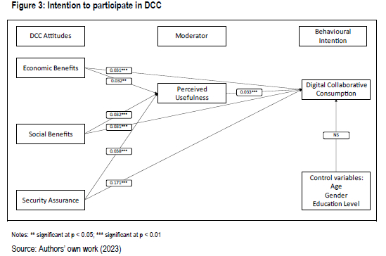 This study is divided into two folds: first, to identify critical factors that impact DCC, and second, to develop a model to explain the intention to participate in the DCC business model in an emerging market. Table 4 compares the relationship of variables through structural equation modelling, path estimates and t-tests. The predictors, namely, economic benefits (H1a,b), social benefits (H2a,b) and security assurance (H3a,b), are significant predictors of the DCC business model. There are few studies which examine the DCC relationship in developed countries. For example, Moeller and Wittkowski (2010) and Akbar et al. (2016) conducted their study in Germany, Han et al. (2022) conducted their study in Las Vegas, USA, and Lindblom et al. (2018) conducted their study in Finland. The current study found similarities in the South African market. Economic benefits had strong, significant behavioural intention towards DCC and a weak relationship towards the attitudes denoted by perceived usefulness.