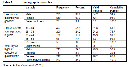 This study sought information on socio-demographic variables: age, gender and educational background. Burgess and Harris (1998) report South Africa to be one of the countries with a high level of diversity, as witnessed by many ethnic groups. Socio-demographic variables are used to segment the consumer market in marketing research. This study reported socio-demographic variables as control variables to control their effect in the research context (Burgess & Steenkamp, 2006; Steenkamp & Maydeu-Olivares, 2021). This study posits the following hypothesis: