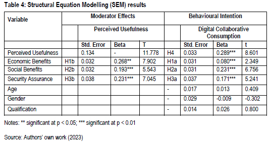 The three predictors for the model, i.e., social benefits, economic benefits and security assurance, were used to predict behavioural intentions. Perceived usefulness was the mediator of the model. This study's criterion, i.e., the dependent variable for this study, was DCC. The model accounted for 29.2% of the variance in perceived usefulness. R-squared (R2) measures the amount of variance in the dependent variable that the predictors, i.e., independent variables, account for when taken as a group. ANOVA test if R2 is significantly greater than zero. The overall regression model was significant F (3.824) = 113.481, p <0.01; R2 = 0.50 for the moderator. For DCC as the criterion variable, the overall regression was significant F (7.820) = 62.794, p < 0.01; R2 = 0.50, indicating that South African consumers prefer buying online. The results of the model are summarised in Table 4, where structural model results, including path estimates and t-statistics, are indicated. The impact of economic benefits on perceived usefulness showed a weak positive effect, whilst the same variable had a strong impact on DCC (H1b: β = 0.268, t = 7.902, p < 0.01; supported) and a weak significant impact on DCC (H1b: β = 0.080, t = 2.349, p < 0.05; supported). Strong significant effect for both direct and indirect effects of social benefits and DCC was realised (H2a: β = 0.231, t = 6.756, p < 0.01; supported) and perceived usefulness (H2b: β = 0.193, t = 5.543, p < 0.01; supported). The same trend applies to security assurance as the results were significant for both direct and indirect effects on DCC (H3a: β = 0.289; t = 8.601, p < 0.01; supported) and perceived usefulness (H3b: B = 0.231, t = 7.045, p < 0.01; supported). Finally, the mediator had a strong positive significant effect on the criterion, DCC (H4: β = 0.289, t = 8.601, p < 0.01; supported). The effect of control variables, i.e., age, gender, and educational qualifications, on digital collaborative consumption was not significant. However, their inclusion assists marketers in understanding different segments in the marketplace, which is useful for targeting and positioning.