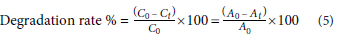 The photocatalytic degradation achieved is inversely proportional to the initial concentration. The likely cause is that more and more dye molecules are adsorbed to the catalyst surface when the initial concentration increases. Therefore, since there are only a few active sites for the adsorption of hydroxyl ions and hydroxyl radicals, the formation of hydroxyl radicals will be reduced.