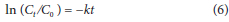 where: k is the rate constant, C0 is the initial concentration at time t = 0, and Ct is the concentration at any time t during the reaction. According to pseudo-first-order kinetics, the reaction constant (k) is calculated by plotting ln (Ct/C0) versus the reaction time (t). In general, the pseudo-first-order kinetics model is convenient for the overall concentration range for low concentrations. Various studies have shown that the rate of photocatalytic activity was well assessed by fitting the experimental data to this kinetic model (Hasanpour and Hatami, 2020; Kim et al., 2013; Lu et al., 2018; Najafidoust et al., 2019; Vaiano et al., 2014; Wang, 2007; Xiao et al., 2007). The resulting linear relationship demonstrates that the photodegradation of organic pollutants is well described by the Langmuir-Hinshelwood (L-H) kinetic model.