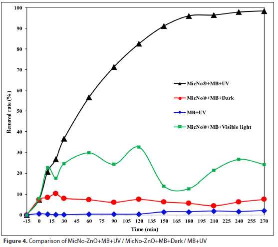 This can be attributed to the fact that the adsorption-desorption of MB on MicNo-ZnO occurs at certain intervals. Under the UV lamp with catalyst, MB removal reached 91.13% in the 150th minute and 96.04% in the 180th minute.