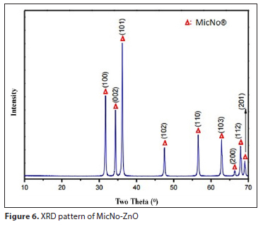 Figure 6 shows the XRD pattern of the catalyst particles. The peaks in the XRD pattern confirm that the catalyst particles are single-phase ZnO with a hexagonal wurtzite-type crystal structure. It should be also noted that the peaks demonstrate a broadening effect which suggests that the primary particles of the catalyst are nano-sized.