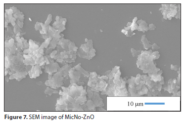MicNo-ZnO particles, used in this study, were provided by Entekno Materials, Inc. The particles were characterized by an x-ray diffractometer (XRD) and a scanning electron microscope (SEM) to determine crystal phase, and size and morphology of the particles, respectively. In addition, specific surface area of the particles was measured by a BET analyser. Prior to the BET analyses, the powder samples were degassed at 120°C for 18h. Furthermore, particle size distribution of the particles was determined by the laser light scattering method. Aqueous suspensions of the particles were treated by an ultrasonic tip for 3 min before the analyses.