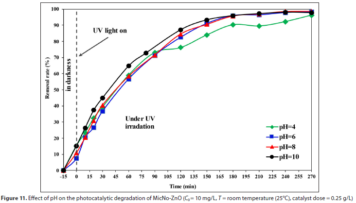Since the pH range of wastewater differs, pH is one of the other main parameters to be considered for dye degradation in the presence of a catalyst. In photocatalytic dye degradation, the initial pH may result in a different activity for each dye and catalyst (Hasanpour and Hatami, 2020). In Fig. 11, the effect of initial pH on photocatalytic degradation of 10 mg/L MB using 0.25 g/L MicNo-ZnO is shown. The MB solution has an initial pH of about 6. In this study, pH values of 4, 6, 8, and 10 were studied. There is no sharp change in MB degradation over time at pH values of 6, 8 and 10 (Fig. 11). There is a minimal increase in removal at pH 10 compared to pH 6 and 8. This may be related to the pH zero-charge point (pHpzc) value of MicNo-ZnO being 8.5. Above the pHpzc value, the net surface charge of MicNo-ZnO becomes negative, indicating that better results can be obtained for MB with a cationic character. At pH 4, the removal efficiencies until the 90th minute are approximately the same as for other pH values, while a decrease is observed after the 120th minute.