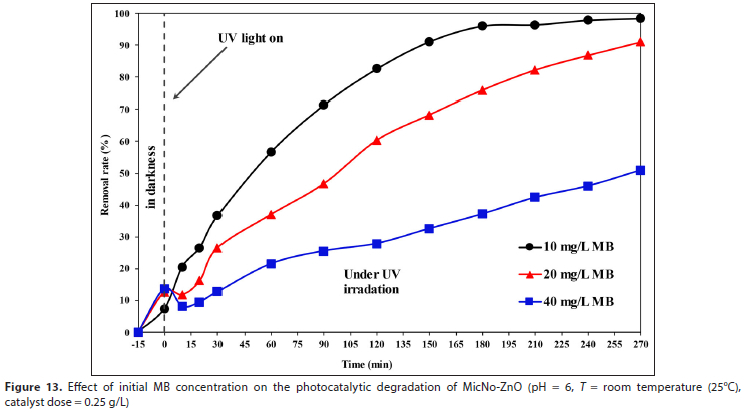 The photocatalytic activity of MicNo-ZnO was determined at different initial concentrations of MB with 0.25 g/L catalyst. The lowest concentration tested, at 10 mg/L MB, degraded the fastest (Fig. 13: 91.13% at 150 min, 96.04% at 180 min, 96.44% at 210 min, 97.86% at 240 min, 98.42% at 270 min). An increase in initial MB concentration resulted in lower degradation and lower removal/efficiency.