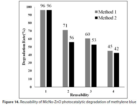 Reusability of catalyst materials is an important and decisive factor for sustainable and practical applications (Bel Hadjltaief et al., 2018; El-Yazeed and Ahmed, 2019; Najafidoust et al., 2019). In this study, reusability was investigated under optimum conditions in consecutive periods with two methods specified in the title "Photocatalytic degradation of methylene blue" (Bel Hadjltaief et al., 2018) MicNo-ZnO efficiency was investigated for up to 4 cycles (Fig. 14). The methods were performed again after each cycle. It was concluded that Method 1 (air-dried, kept under UV light for 3 h) is better for this catalyst to recondition the surface activity. With this method, a decrease in degradation of 26% occurred in the second cycle, which indicates that the catalyst's efficiency tends to decrease slowly from the second cycle onward.