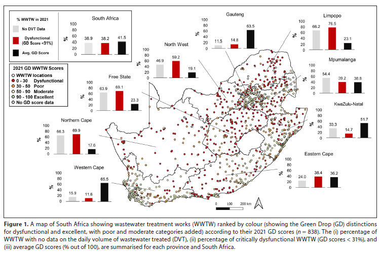 The most recent GD report (DWS, 2023a) highlighted that the wastewater situation had deteriorated across almost all sectors compared to 2021. Perceptions of water service delivery, including sanitation, have also declined consistently over the past decade, with dissatisfaction the highest it has been since monitoring began (Slabbert, 2022). Approximately half of users in urban areas in South Africa believe that their municipality rarely or never attends to water and sanitation issues, including broken and leaking pipes, or sewage spills (Slabbert, 2022). The GD statistics showing the poor state, including some comparisons to previous reports, are available in the latest publicly accessible report (DWS, 2023a). Some statistics on missing data and treatment volumes are worth highlighting: (i) despite the fact that it is mandated, 30% (n = 263) of WWTW did not have registered information on what wastewater treatment systems they use, (ii) only 25% (n = 219) of WWTW were reported to be operating at an acceptable hydraulic capacity (50-100% DCU), with 7% (n = 61) providing no information on the design capacity of the facility, and (iii) alarmingly, 43% (n = 377) of WWTW reported having no maintenance teams in place whatsoever. Data gaps make it impossible to determine if the treatment processes are appropriate for the catchment being serviced, to estimate if the volume treated (even if it were measured) is above or below the design capacity, or to identify potential issues.