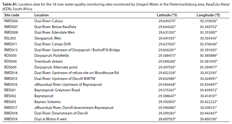 Inflow data for the Darvill WWTW and Escherichia coli data from the 18 river monitoring sites in Pietermaritzburg (Fig. A1; Table A1) were publicly available within monthly catchment management forum reports and used with permission from Umgeni Water who collect the data as part of DWS-mandated monitoring.