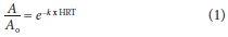 where: A = amount of pollutant remaining in the system (kg); Ao = initial amount of pollutant in the system (kg); k = pollutant removal coefficient; and HRT = hydraulic retention time (h-1).