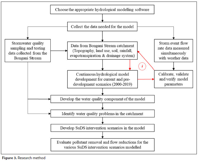 This research aimed to evaluate stormwater management interventions that could improve the water quality of the Bongani River. The steps taken in developing the continuous model included (Fig. 3): selecting an appropriate modelling software; collecting various data for the model; developing the hydrological and water quality models; and investigating the potential impact of various SuDS interventions by evaluating the theoretical reductions of pollutant loads in the Bongani River upon their introduction. Water quality data collected by Harvey (2019) identified that the Bongani River catchment has a problem regarding nutrients and E. coli. This investigation thus continued the research into stormwater pollution in the Bongani River by measuring water quality by the concentrations of nutrients and sediment and counts of E. coli at key points throughout the catchment. The water quality data were used to identify problem areas and provide input into the water quality model.