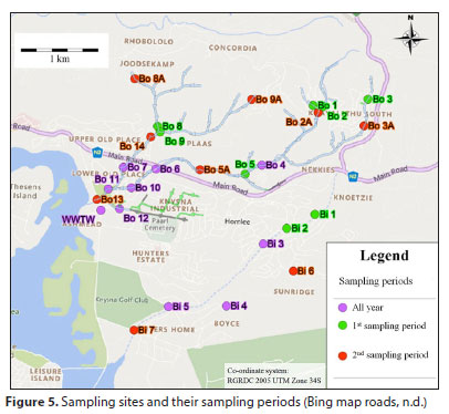 The sampling and testing across the Bongani River catchment were undertaken in collaboration with the Knysna Basin Project (KBP) - a local NGO that helped with sampling and testing and provided a laboratory for testing. The monthly sampling and testing included 12 sites along Bongani River, the Knysna WWTW effluent, and 7 sites along the Bigai Stream. This study focused on the results from the sites in the Bongani River catchment (Fig. 5). Initially, 12 specific site locations were selected for sampling and testing in the Bongani River catchment. After 6 months of data collection from these sites, however, 6 of the sites were replaced by new sites to acquire data from the tributaries of the Bongani River not covered in the first 6-month data collection period. The two distinct sampling periods, which occurred between February 2019 and February 2020, were denoted as the 1st and 2nd sampling periods, respectively.