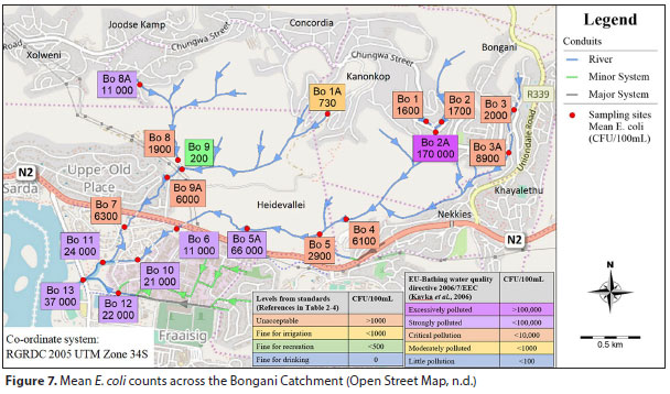 The water quality measurements for the Bongani River included nutrients and E. coli. A map of the sample sites with the mean SRP concentrations and the mean E. coli counts for each site are provided in Fig. 6 and Fig. 7, respectively.